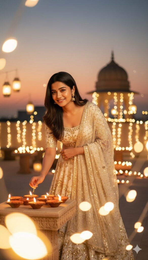 4k picture of a young Indian woman standing atop She is posing fashionably while sporting a lovely smile and a lehenga in shades of white and gold. The rooftop diyas are being illuminated by her. A creamy and gentle bokeh effect of light lamps and flare lights is reflected in the background, which is rich in dramatic and cinematic elements.