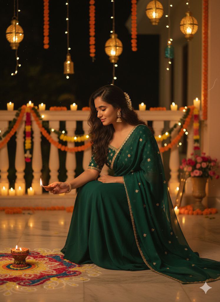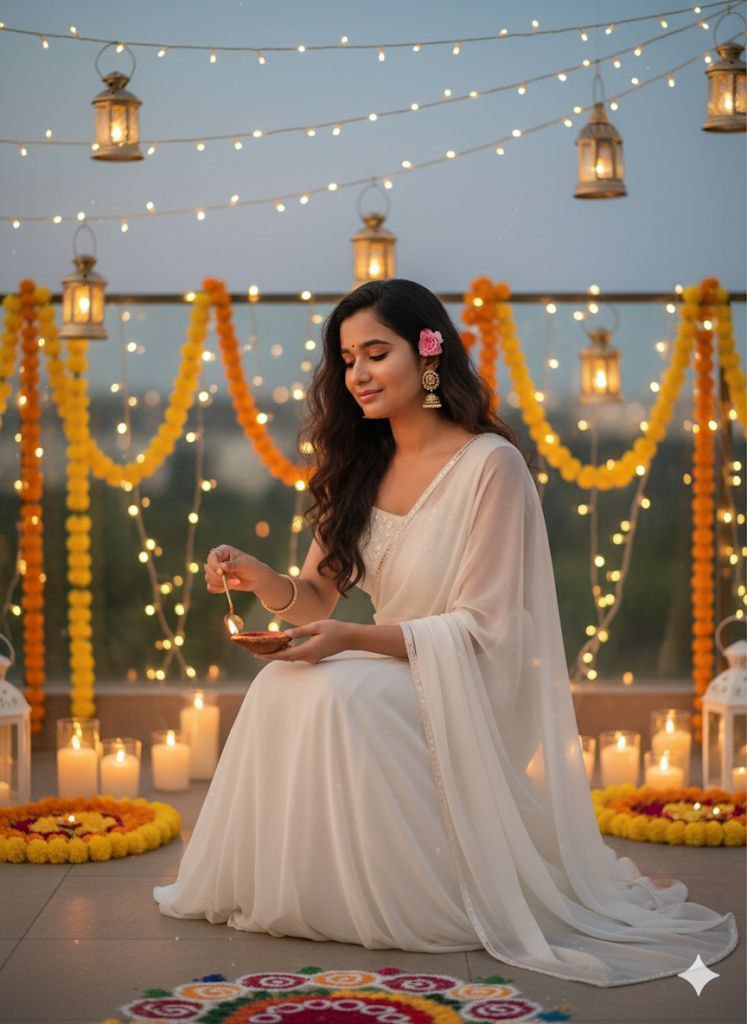 Background is outdoor with a modern festive look – balcony or terrace decorated with fairy lights, lanterns, glowing candles, flower garlands, and elegant rangoli.
